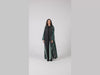 The Frame abaya is adorned with a painterly mix of green stripes, some bold, others fine, layered like brushstrokes across the fabric. The vertical flow elongates the form while allowing the print to breathe, balancing movement with quiet intent.
