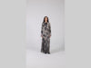 This silk georgette abaya captures shadow and light through a cascade of black and grey florals, softly blurred to evoke depth and illusion. The hazy background and abstract blooms create a dreamlike feel, understated yet layered with emotion.